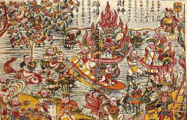 財神只有一個,加上四員下屬也只湊成了一個巴掌之數,想發財的人卻有那么多,供不應求是明擺的,于是便有人主動出頭,平衡供需矛盾,由此導致出一幅新的風俗畫--"送財神"每逢初五之日,貧民乞丐三五結伙,戴起面具,扮成財神班底,號稱"送財神",也叫"跳財神"。主人例須當場送上錢幣酬謝,否則便在你家門口或店鋪前鬧個不停,徒惹圍觀者哂笑,倒不如破費一點,快把這班"活財神"送走完事。窮光蛋扮活財神,搶財神變送財神,這出充滿諷刺意味的街頭鬧劇,倒也稀里糊涂的迎財神習俗增添了不少額外的情趣。近幾年來結伙跳躍的"送財神"景象已經不見,起而代之的是單獨行動--不聲不響走到門前,拿張背面有不干膠的紅紙財神像往門板上一貼,隨即伸手討錢,正見得時進俗易、推陳出新哩。據說,財神爺是有錢人家供奉的,沒錢的人供奉是不會顯靈的。民間流傳有"財神菩薩休妻"的故事:從前,財神廟財神身邊總有一位端莊美麗的財神娘娘陪伴。后來這位善良的女菩薩突然不知去向,原來她被財神爺給休掉了。財神爺為什么要休妻呢?這要從一個乞丐說起。有個討飯的叫花子窮得無路可走,討飯路過一座古廟。進廟后,他什么菩薩都不拜,單摸到財神爺像前,倒頭便拜,口里祈求財神爺賜財。趙公元帥見是一個叫花子,心想連香燭都舍了得點,還來求財?天下那么多窮叫花子,我能接濟得過來嗎?可乞丐心中想的正相反,他認為財神總會救濟窮人的,富人不愁吃穿,求財何用?便不住地拜。這時,財神娘娘動了惻隱之心,想推醒打瞌睡的財神夫君,勸他發善心給這叫化子一點施舍。可財神爺不理睬,打了兩個哈欠又閉上了眼睛。雖然是財神娘娘,可財權在夫君手上,夫君不點頭,怎么好將錢賜給叫化子呢?娘娘無奈只得取下自己的耳環,扔給了叫化子。乞丐突然感到神龕上擲下一物,一見是一副金耳環,知道是財神所賜,急忙磕頭,連呼"叩謝財神菩薩"。財神爺睜眼一看,發覺娘娘竟將自己當年送她的定情物送給了窮叫花子,氣得大發雷霆,將財神娘娘趕下了佛龕。自此以后,數百年來就再也沒有一個窮人是拜了財神而發財的。