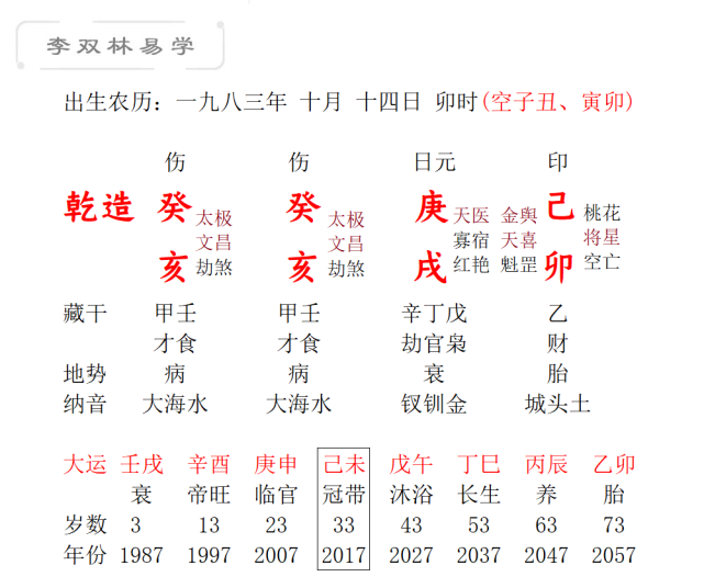 以太陽帶出沒出,看能看清對面的人和物為寅時。太陽一人來高為卯時。太陽 一樹頭高為辰時。太陽持續升溫,到最熱為巳時。太陽恒定高溫時為午時。溫度逐漸下降,但是還很熱為 未時。溫度持續下降很多太陽偏西時為申時。太陽已經落下,但還能看到對面物體時為酉時,就是我們說 的日落酉時。天完全黑了為戌時,點燈戌時。人定亥時,人都睡熟為亥時。 《劉恒命理學》--4 空亡是什么: 陰和陽是沒有絕對的界限的,所謂陰極陽生,陽極陰生。陰和陽是相對的而不是絕對的。那么陰和陽的界 線是什么呢?那就是空亡,空亡時陰陽不顯。 在我的八字經驗里,空亡只有月令和時支可以為空,以日干支定空亡的字。時支空亡就當沒有這個字。月 令空亡以年支定旺衰。月令空亡時,年支與日支為相臨,可相互作用;年支不為空,在大運流年出現也不 一個大運中的流年逐年添實命局中的空亡,當流年也空亡時,先把流年不空斷一個結果,然后反過來就是正確的結果。這個結果常常是日干本人在從事這件事情時對這個事情前途的設想,而實際結果總與這個結 果相反,于是我把空亡流年的斷法總結了如下公式:以為。。。。。但是。。。。。,公式中的“以為”后 邊所代表的內容是指把流年地支看作不空斷出的那個結果,公式中的“但是”后邊所代表的內容是把流年看 作不空斷出的結果反斷后的結果,反斷后的結果才是生活中發生或已經發生了的事情。