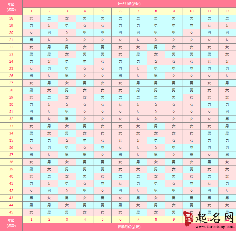 以下是一份2018年生男生女預測表,表中1~1是代表懷孕月份,18~45代表女性的年齡,女性年齡是以農歷虛齡(即真實年齡加1歲)計算,而懷孕月份即是受孕的那個月份。