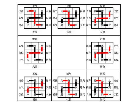 離宅-大吉(生氣方)在正東方,次吉(延年方)在正北方,中吉(天醫方)在東南方,小吉(伏位方)在正南方。大兇(絕命方)在西北方,次兇(五鬼方)在正西方,中兇(六煞方)在西南方,小兇(禍害方)在東北方。