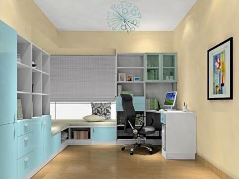 書房的家具除了要有書櫥、書桌、椅子外,兼會客用的書房還可配備沙發茶幾等。書櫥應靠近書桌以存取方便,書櫥中可留出一些空格來放置一些工藝品以活躍書房的氣氛,書桌應置于窗前或窗戶右側,以保證看書、工作時有足夠的光線,并可避免在桌面上留下陰影。書桌上的臺燈應靈活、可調,以確保光線的角度、亮度,還可適當布置一些盆景、字畫以體現書房的文化氛圍。