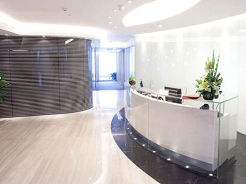 前臺的尺寸大小要根據公司的具體行業和規模大小來確定,但一般情況下,應將前臺在適宜的范圍內盡量做大一些,這樣可以彰顯公司的高貴,大方的氣派,有助于樹立公司良好的形象。對于小型公司來說,若在有限的空間內放置一個寬大的前臺,則會使其他辦公區域看起來局促,狹小,且整體比例有失協調。此時前臺的設計就要以簡潔實用為主,既滿足前臺的工作需要,又不影響整體美觀。色彩上可以選用較為輕快,明朗的色調,這樣可以防止產生沉悶和空房間上的局促感。