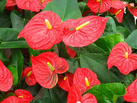 紅掌葉子肥大厚實,花色艷麗,花序顏色金黃,具有富貴的寓意,頂部火紅色花朵象征鴻運當頭,而中間的金色豎型花穗象征金錢,具有招來財富的意義。紅色是我國古代傳統的吉祥色,因此可將其用于辦喜事的場所,如新店開張,象征事業上的紅火,帶來好運。